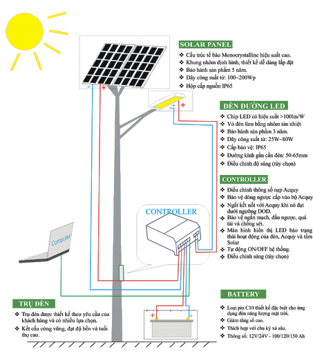 Mỗi hệ thống chiếu sáng đường phố sử dụng đèn năng lượng mặt trời được hoàn chỉnh với một tổ hợp tích hợp năng lượng mặt trời- ắc quy- nạp dự phòng tự động vận hành khép kín với kích thước gọn nhẹ để dễ dàng lắp đặt chiếu sáng theo yêu cầu của khách hàng. Đội ngũ kỹ sư thiết kế của công ty sẽ tính toán công suất và các thành phần cần thiết cho từng hệ thống phù hợp với vị trí địa lý của các vị trí lắp đặt.